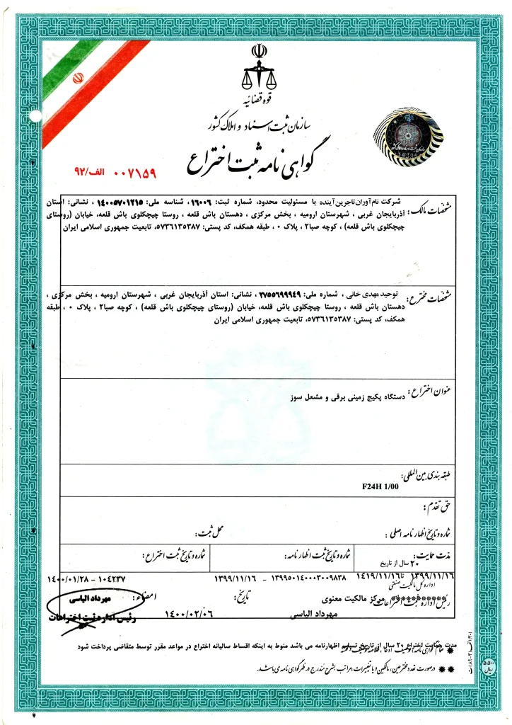 دومین گواهی اختراع با عنوان «دستگاه پکیج زمینی برقی و مشعلسوز» به شماره ثبت ۲۷۵۹/الف۹۲، گامی مؤثر در توسعه تجهیزات گرمایشی با راندمان بالا و سازگار با محیط زیست محسوب میشود. هر دو اختراع تحت حمایت قانونی مرکز مالکیت معنوی بوده و برای مدت بیست سال از تاریخ ثبت مورد حمایت حقوقی قرار گرفتهاند. این دستاوردها نشانگر مسیر روبهرشد کارخانه در زمینه طراحی و تولید تجهیزات صنعتی، حرارتی بوده و تأییدی بر جایگاه نوآورانه و دانشبنیان مجموعه در صنایع کشور است.